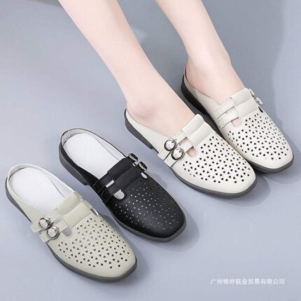 Flat Soft Leather Hollow Breathable Mom Shoes for Outdoor Wear