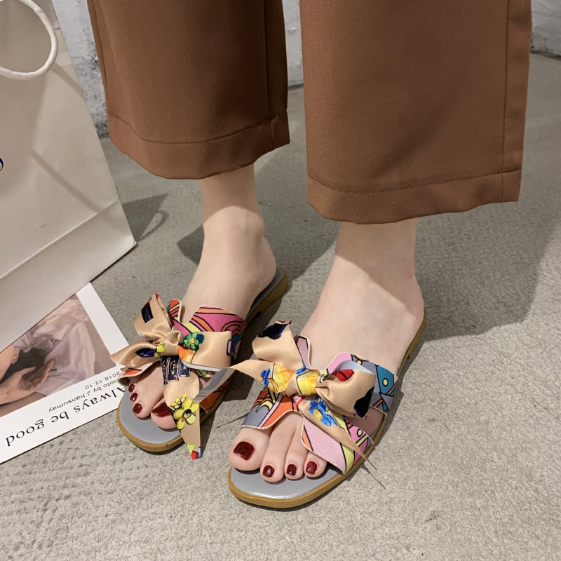 Colorful ribbon bow flat heel slippers for women